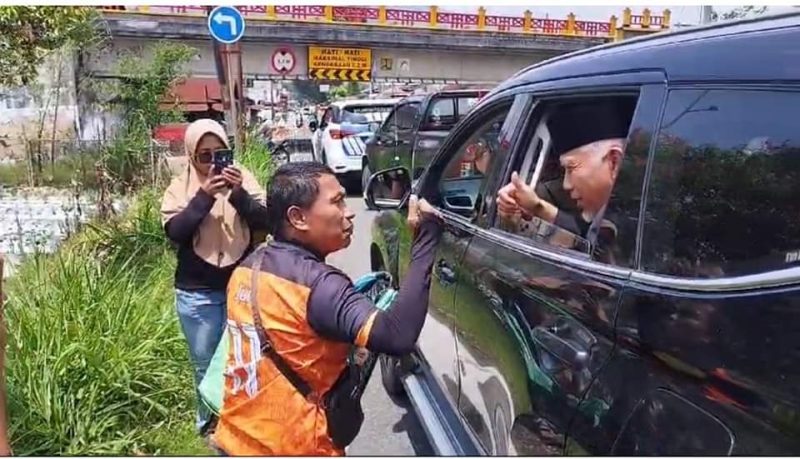 “Mohon maaf pak, ada yang bisa kami bantu? Berbahaya pak, jangan berdiri di badan jalan,” ucap Mahyeldi.