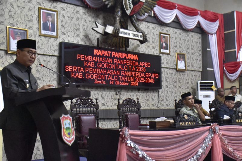 Pada rapat paripurna yang digelar Senin (14/10), di ruang sidang DPRD Kabupaten Gorontalo, terlihat pihak eksekutif dan legislatif membahas dokumen Anggaran Pendapatan dan Belanja Daerah (APBD) tahun 2025 dan Rencana Pembangunan Jangka Panjang Daerah (RPJPD) 2025-2045.
