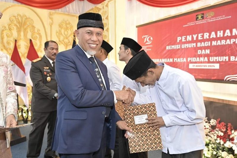 PADANG|sulsel.intainews.id- Gubernur Sumatera Barat (Sumbar), Mahyeldi Ansharullah menyerahkan keputusan pemberian remisi bagi 4.185 Warga Binaan Permasyarakatan (WBP) di bawah lingkungan Kanwil Kemenkumham Sumbar, Sabtu (17/08/2024).